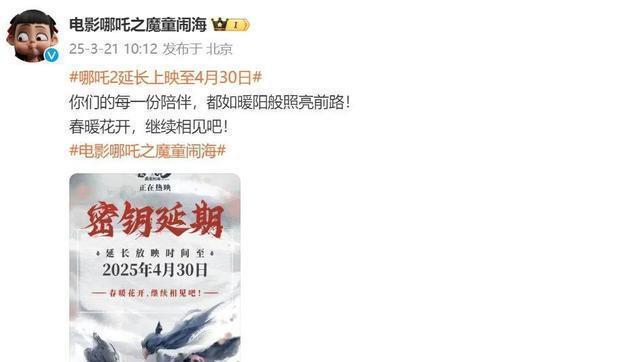 3月21日上午,《哪吒2》官方宣布密钥延期,将再次延期上映一个月至4月30日。