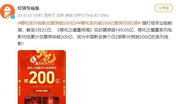 据灯塔专业版数据,截至3月23日,《哪吒之魔童闹海》(以下简称“《哪吒2》”)实时票房超149.65亿,哪吒之魔童系列电影内地累计总票房突破200亿,成为中国影史首个仅2部影片就破200亿的系列电影!