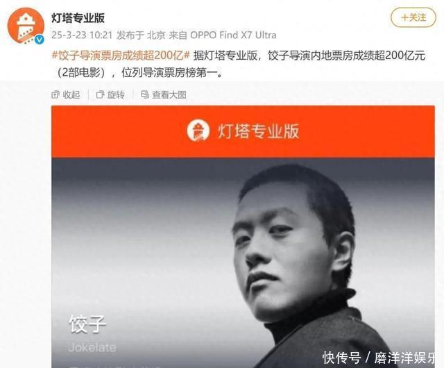 3月23日上午,据灯塔专业版,饺子导演内地票房成绩超200亿元(2部电影),位列导演票房榜第一。
